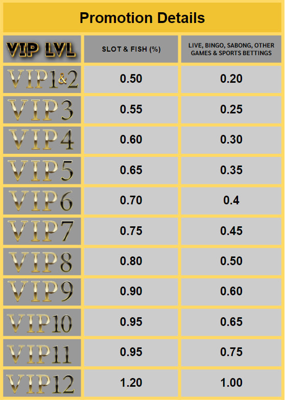- For example, if the member has a membership of VIP12 then the play total on the slot game is 1,000,000 PHP, and play in the live game is 500,000 PHP. They will get a cash rebate back is 17,000 PHP (1,000,000 * 0.012) + (500,000 * 0.01)